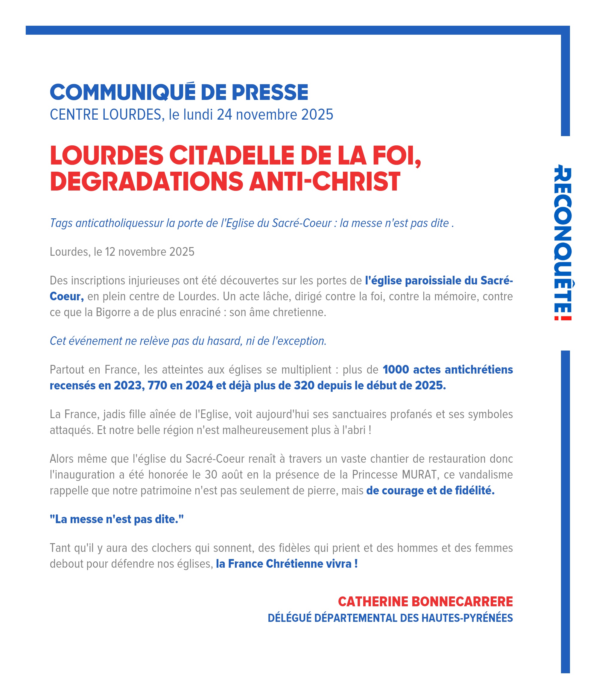 Des inscriptions injurieuses ont été découvertes sur les portes de l'église paroissiale du Sacré-Coeur, en plein centre de Lourdes. Un acte lâche, dirigé contre la foi, contre la mémoire, contre ce que la Bigorre a de plus enraciné : son âme chretienne.